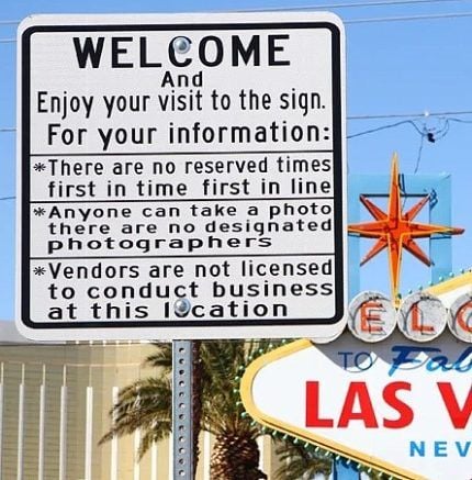 A sign from Clark County attempts to upstage the more famous one with a warning that most tourists don’t bother reading. (Image: Scott Roeben/Vital Vegas)“There are two photographers, a young woman taking the photos with a cell phone and a woman with a professional camera,” Claudia Restrepo posted in the Las Vegas Travel Tips Facebook group this summer. “They transfer the photos to your cell phone. The quality is very good. We were four in the photo and she took 9 photographs. I gave her $20. She tells you how to pose.”